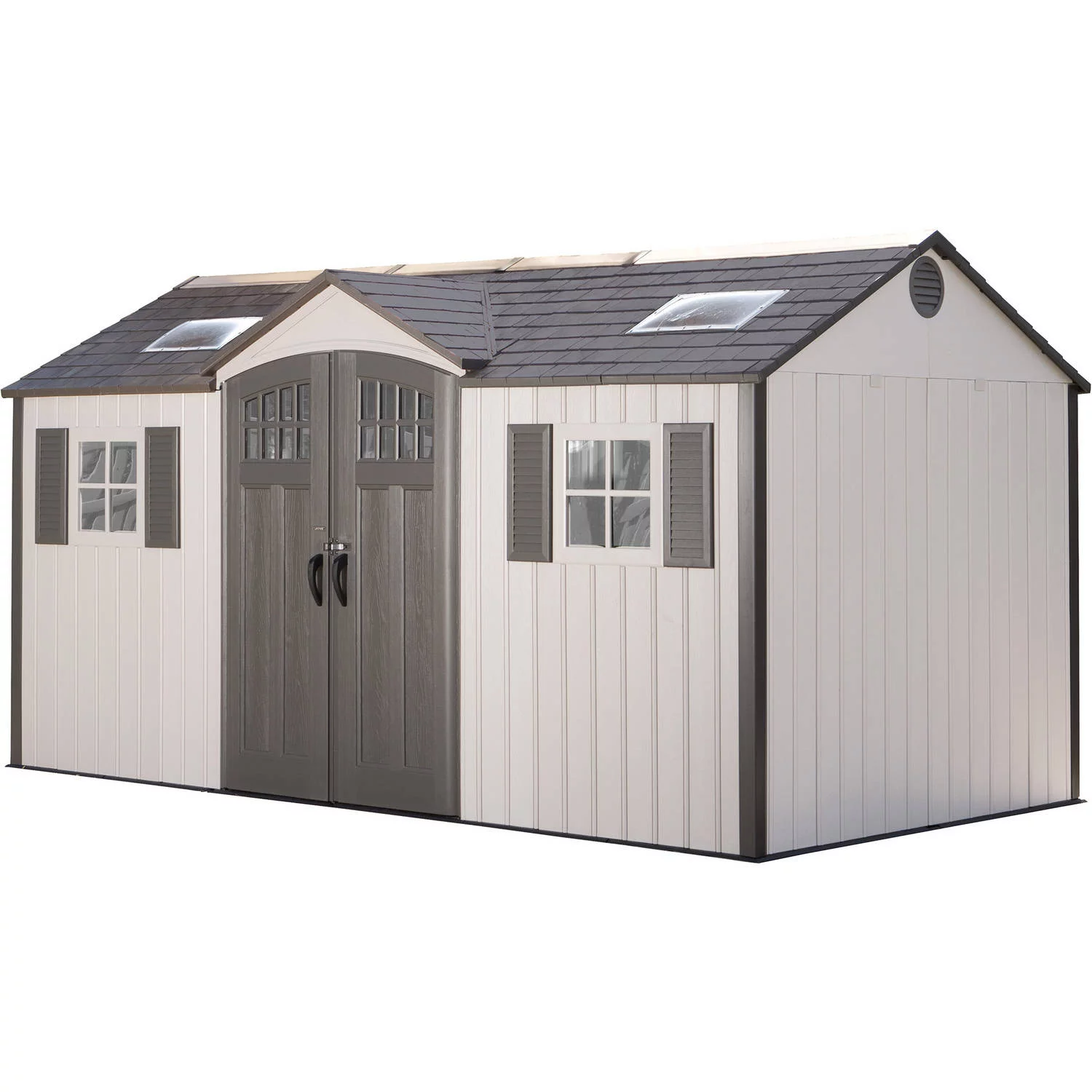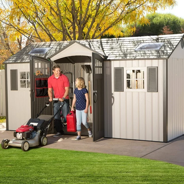 The Lifetime 15′ x 8′ Shed (side entry) features: vertical siding, (2) screened vents, (2) windows, (2) 90″ x 9″ Shelves, a full-length ridge skylight, (2) large skylights, wall hooks, tool storage pouch, snow load kit, and a 10-year limited warranty. Floor and installation hardware included. Comes in (3) boxes.
