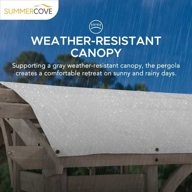 With premium Cedar wood frame construction supporting a gray weather-resistant canopy, the pergola creates a comfortable retreat on sunny and rainy days. - Premium cedar frame construction